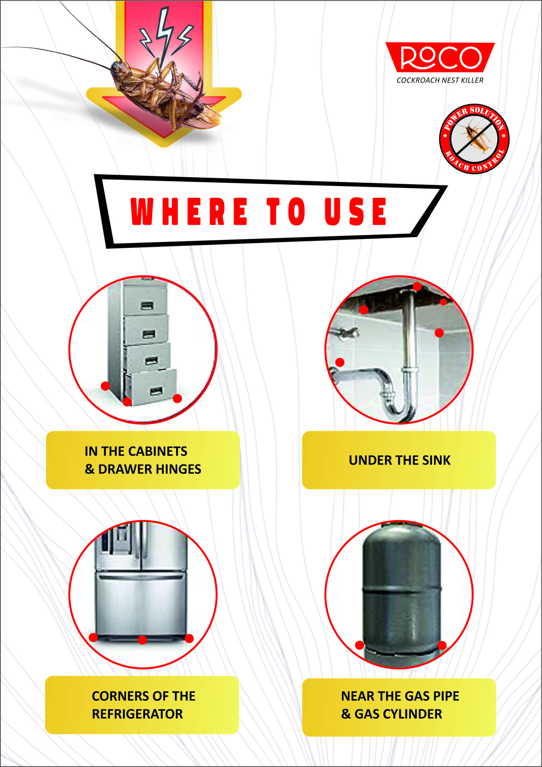 Apply small dots of Roco gel in areas where cockroaches are commonly seen: behind stoves, under the sink, inside cabinets, and along baseboards. Avoid wiping it off or placing it in exposed areas.
